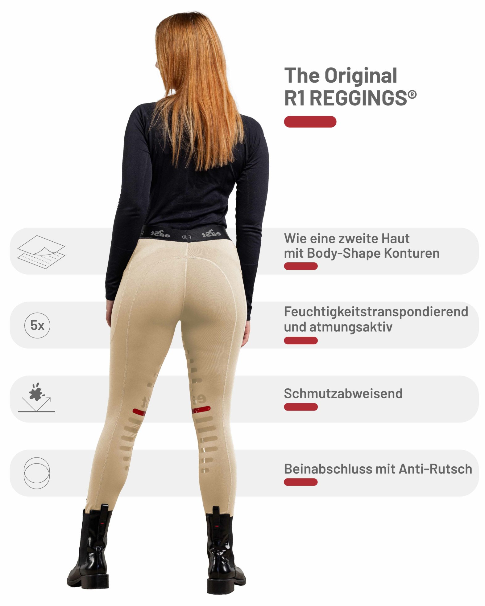 Die Reggings R1 ist die original Reitleggings. Das hochelastische und bewegungsfreundliche Material sorgt für den ultimativen Tragekomfort. Es ist nicht nur feuchtigkeitstransportierend und atmungsaktiv, sondern auch schmutzabweisend – alles, was ein Pferdemensch braucht. Entscheide dich für das Original!