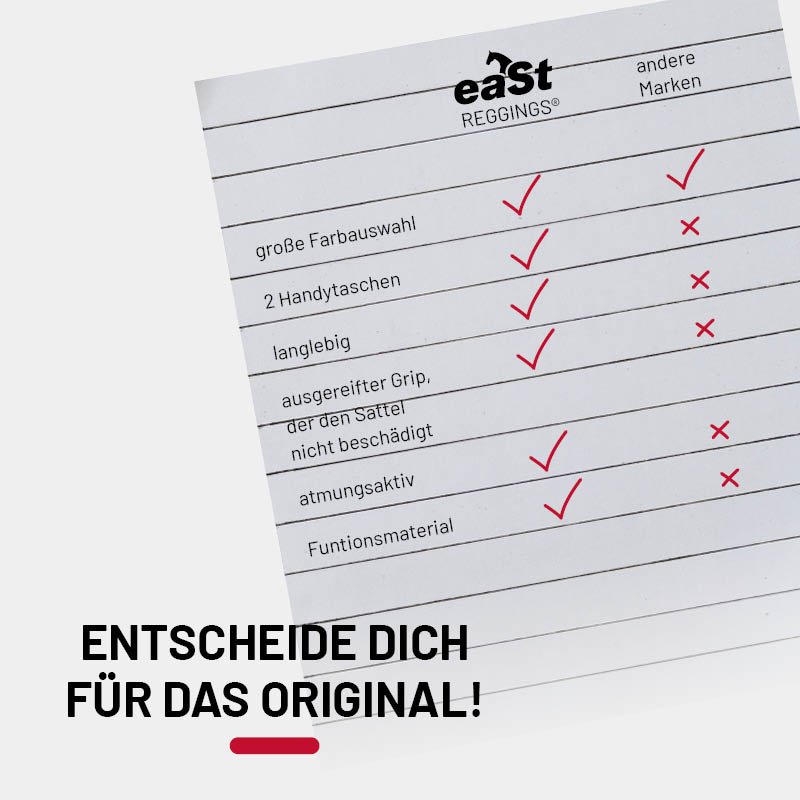 Woran erkennst du die Original Reggings? Am klassischen eaSt-Label in Rot, dem premium Silikongrip, zwei praktischen Seitentaschen, Body-Shape-Konturen, rutschfestem Bund und vielen weiteren hochwertigen Funktionen. Das macht die Reggings unverzichtbar für jeden Reiter.