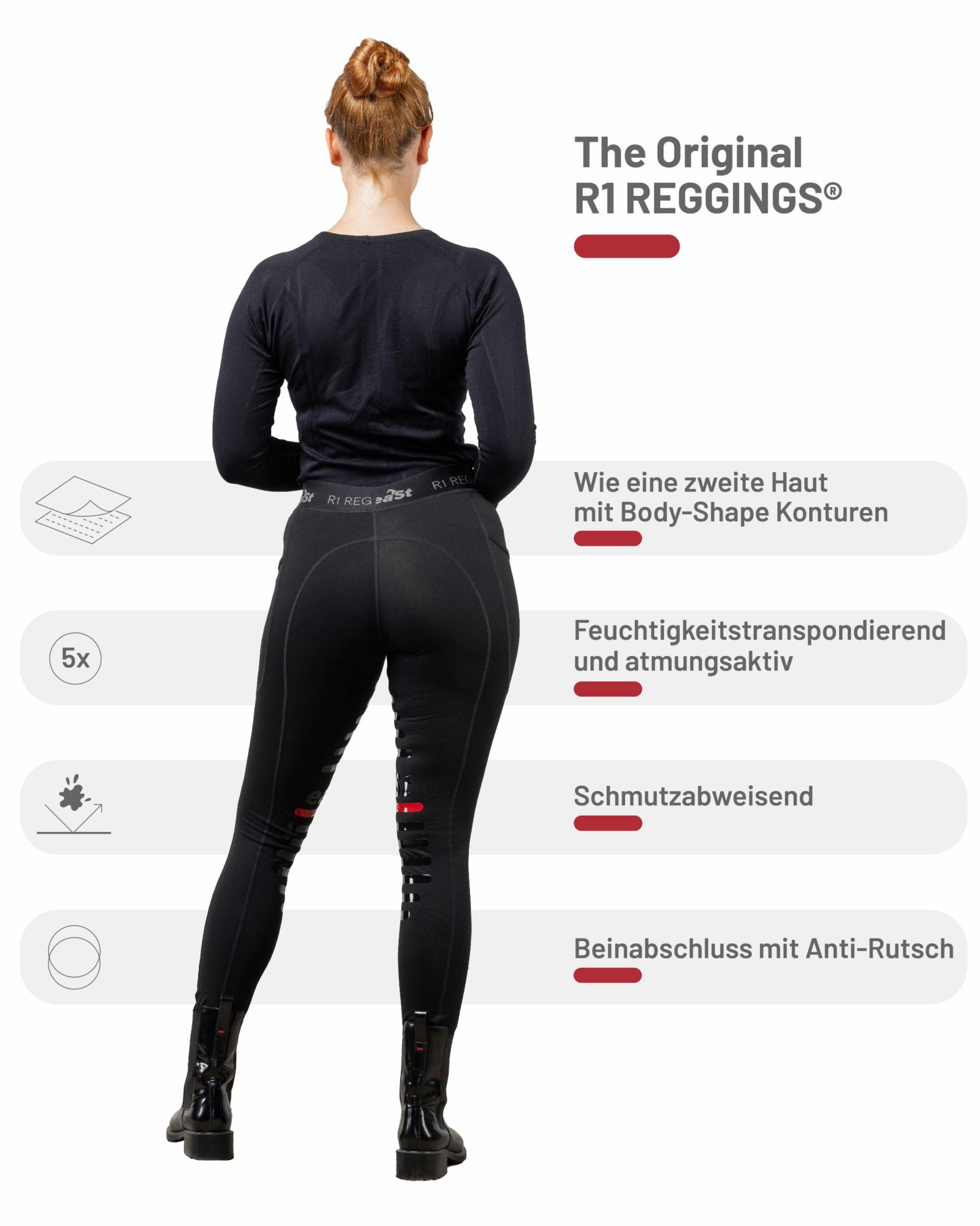 Die Reggings R1 ist die original Reitleggings. Das hochelastische und bewegungsfreundliche Material sorgt für den ultimativen Tragekomfort. Es ist nicht nur feuchtigkeitstransportierend und atmungsaktiv, sondern auch schmutzabweisend – alles, was ein Pferdemensch braucht. Entscheide dich für das Original!