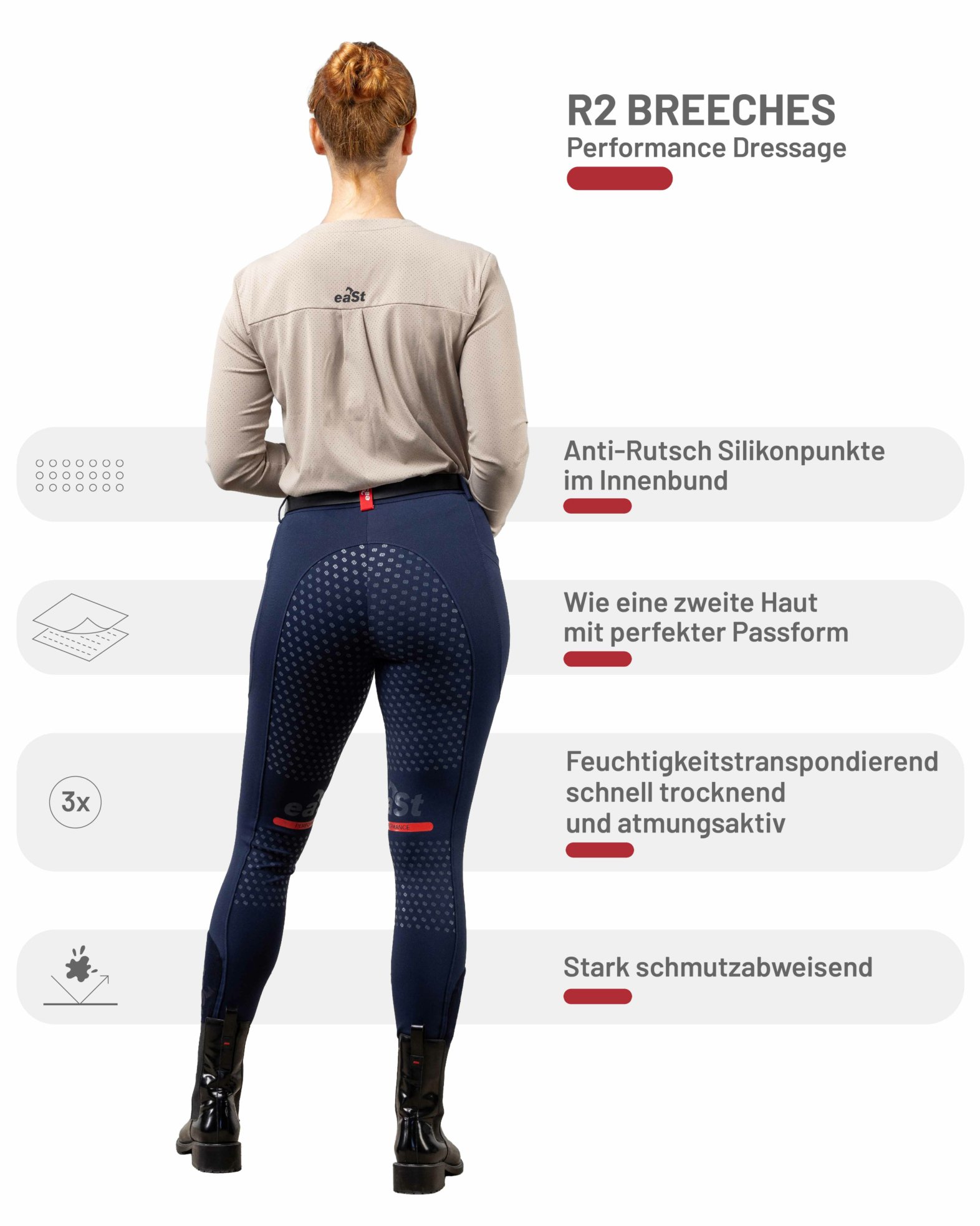 Durch das typisch minimalistische und dabei elegante eaSt Design passt die Reithose perfekt zu allen anderen Teilen der Kollektion. So kannst du nach dem Layering-System immer die passenden Oberteile mit der R2 Performance Dressage kombinieren und von einem technisch wie optisch ausgereiften Outfit profitieren.