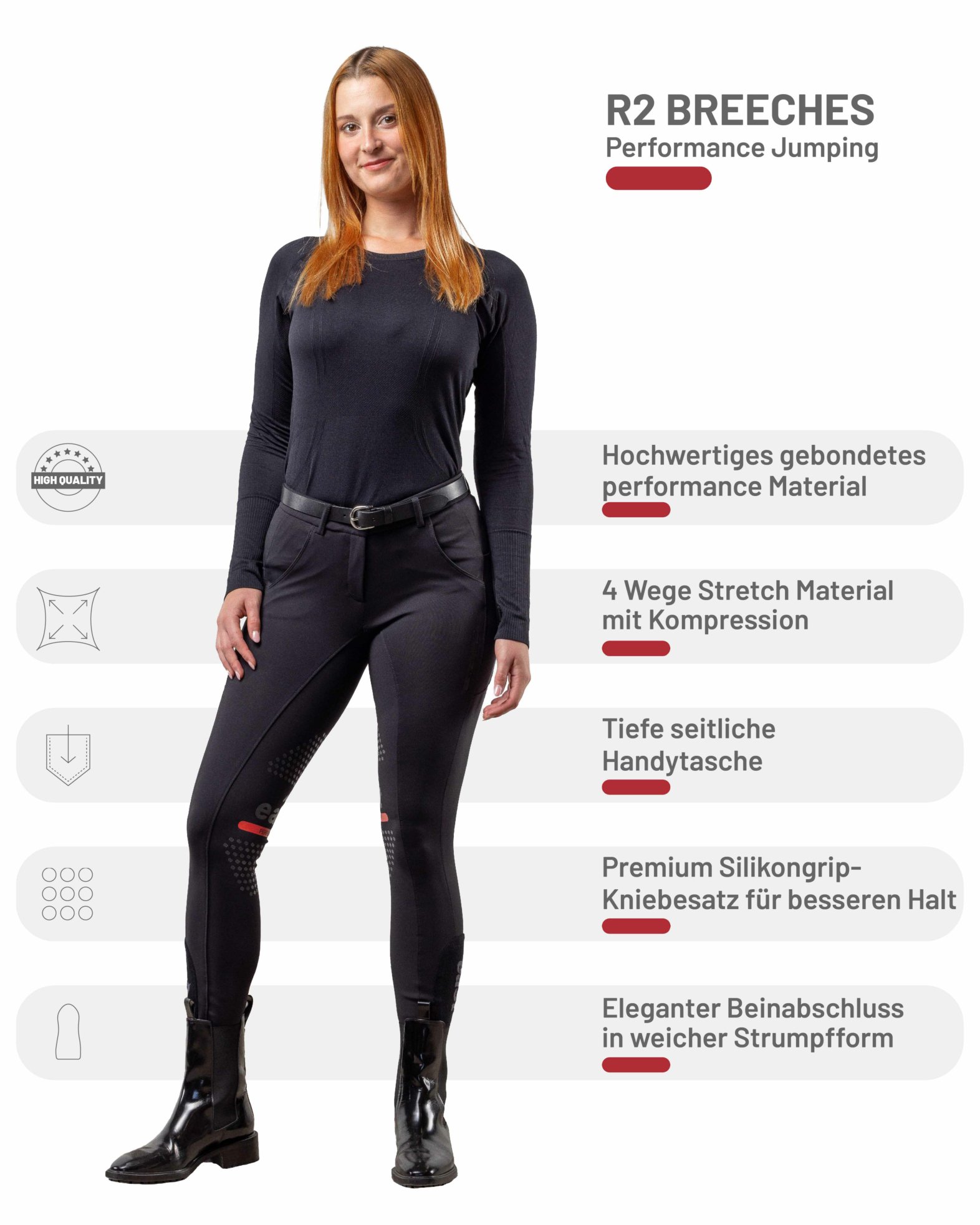 Auf vielfachen Wunsch haben wir die eaSt Reithosen in unsere Kollektionslinie R2 Performance aufgenommen. Maximal elastisch und funktional, verbindet das hochwertige italienische Material Komfort, Eleganz und die Erfüllung höchster Ansprüche in einer Reithose, mit der du nicht nur auf dem Pferd eine sportlich-elegante Figur abgibst. Mit den zwei Modellvarianten Jumping (Kniebesatz) und Dressage (Vollbesatz) bieten wir der Profireiterin bzw. ambitioniertem Amateurreiterin die volle Auswahl für ihre jeweilige Disziplin an. Die R2 Performance Jumping Reithose besticht dabei durch ihren technisch und optisch einzigartigen eaSt Silikon-Kniebesatz. Selbstverständlich reiht sich auch diese Hose in unser innovatives eaSt System ein. Als Core-Element lässt sie sich perfekt mit allen Oberteilen kombinieren, die wiederum nach dem eaSt Layer System optimal aufeinander abgestimmt sind.