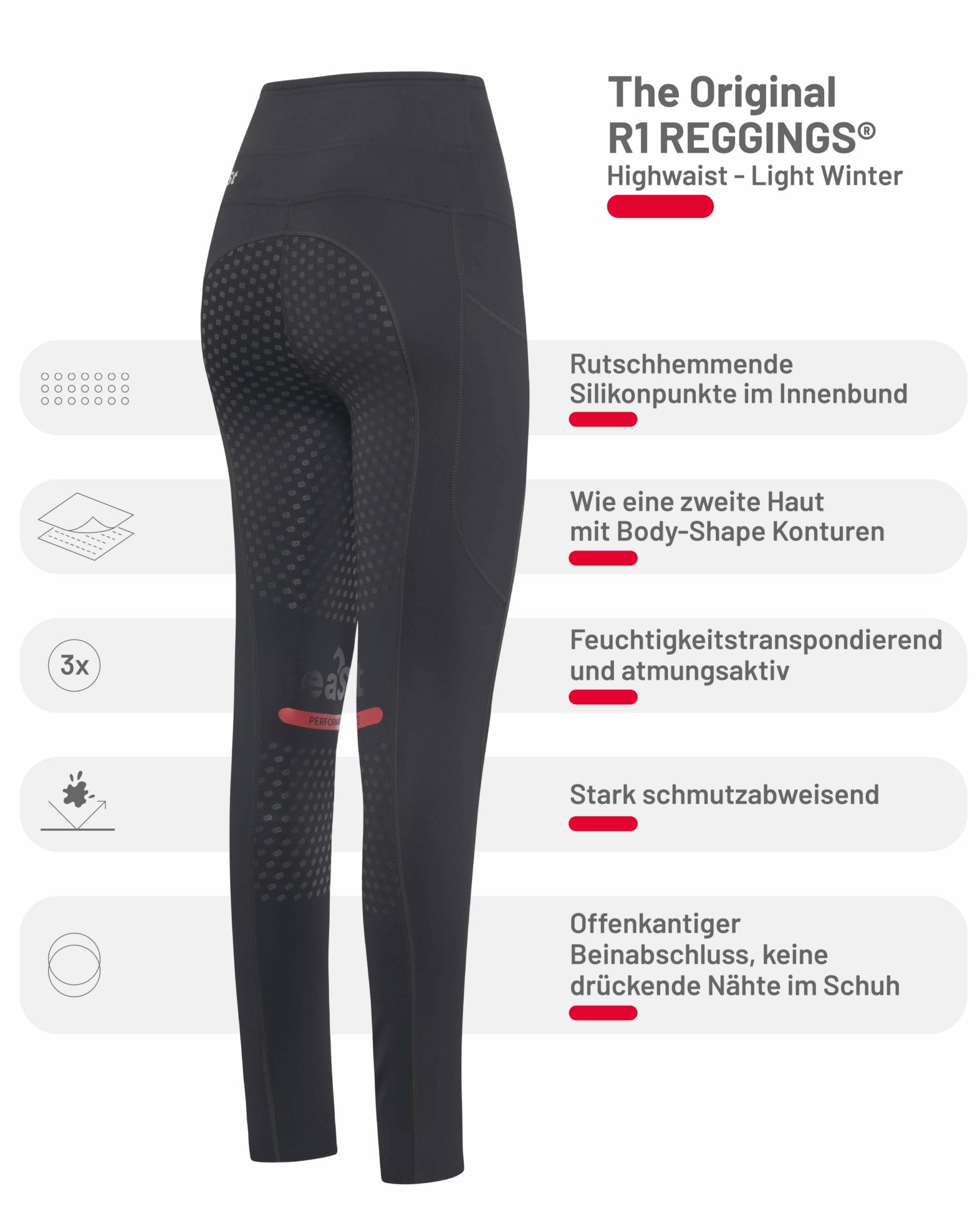 Die REGGINGS® R1 Highwaist light Winter ist die perfekte Wahl für stilbewusste Reiterinnen, die auch bei kühlen Temperaturen nicht auf Komfort und Funktionalität verzichten wollen. Das leichte, atmungsaktive Funktionsmaterial hält Nässe und Kälte ab, während ein warmes Innenfutter aus Fleece für ein kuscheliges Tragegefühl sorgt. Typische Merkmale der R1 wie ein premium Silikonbesatz, tiefe Handytaschen und eine figurbetonte Body-Shape-Kontur finden sich auch in diesem Modell wieder.