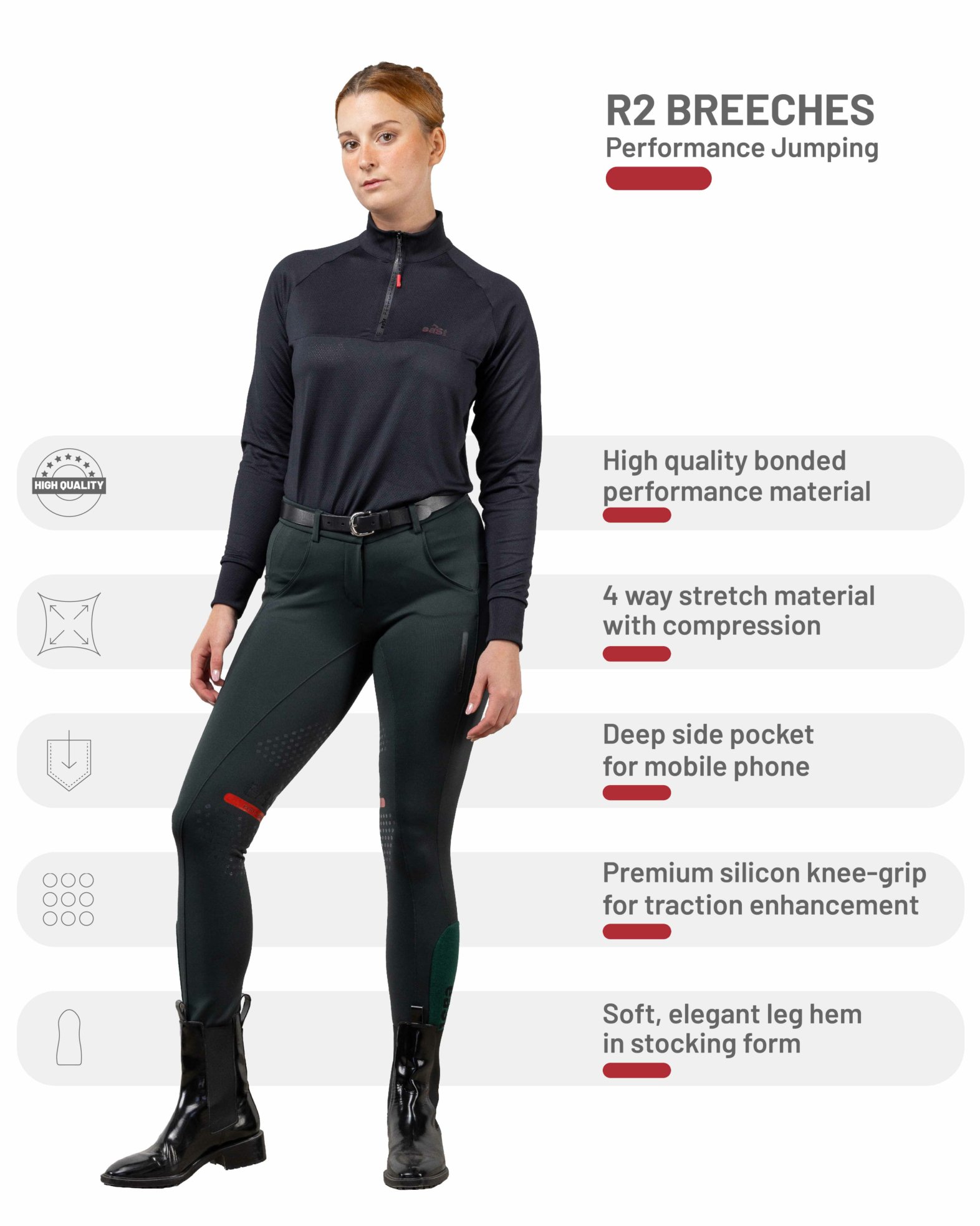 We have added the eaSt breeches to our R2 Performance collection line by popular demand. With maximum elasticity and functionality, the high-quality Italian material combines comfort and elegance whilst meeting the highest demands in a pair of breeches that will not only cut a sporty and elegant figure on the horse. With the two model variations Jumping (knee trim) and Dressage (full trim), we offer the professional rider or ambitious amateur rider the full selection for their respective discipline. The R2 Performance Jumping breeches impress with their technically and visually unique eaSt silicone knee trims. Of course, these trousers are also part of our innovative eaSt system. As a core element, it can be perfectly combined with all tops, which in turn are optimally coordinated based on the eaSt layer system.