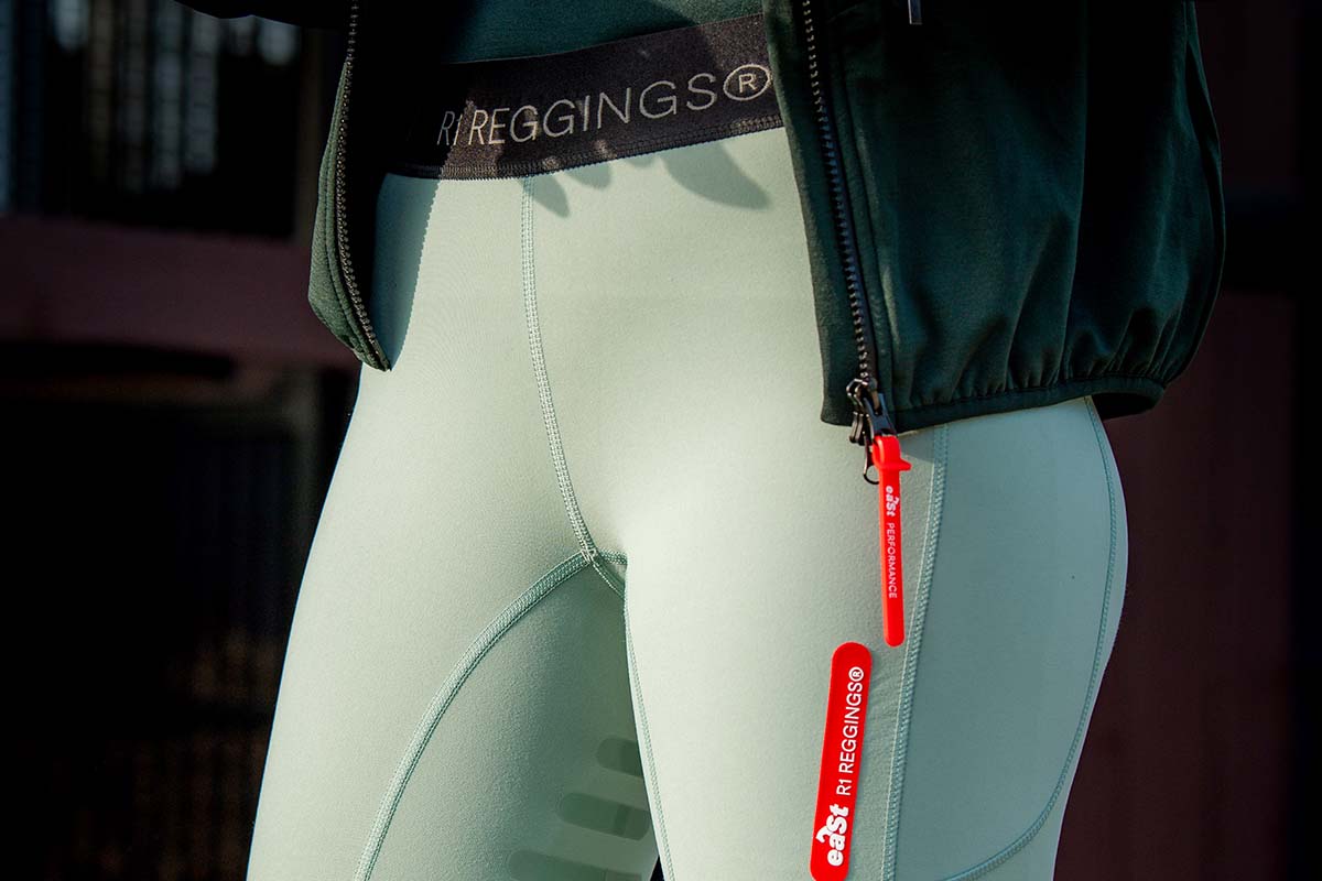 The proven REGGINGS R1 we now offer you the highlight colours pistachio and azure blue. For the standard R1 with half seat and for the R1 Dressage with full seat in these colours, the eaSt Seamless Shirt in dark emerald or midnight blue fits perfectly. The seamless, highly elastic circular knit comfort shirt is available with short or long sleeves and, like the REGGINGS R1, is a functional, fashionable basic for many sports. The subtle shiny chrome zippers give the breathable shirt a touch of glamour. Over the 1st layer, you can wear the eaST Vest Active, which is perfect as a 2nd layer. The wind- and water-repellent vest, in turn, can be matched in midnight blue or emerald green to the R1 in pistachio or azure blue. This creates monochrome spring looks that inspire trendsetters. On cooler days, as a 2nd layer, the long-sleeved eaSt Hybrid Jersey is a great alternative that optimally supports you in all activities with its warm front and well-ventilated back sections.