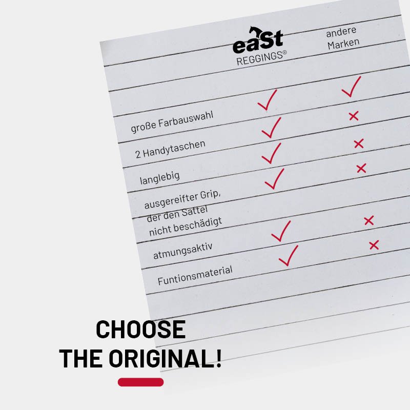 How do you recognize the original reggings? By its classic red eaSt label, the premium silicone grip, two practical side-pockets, body-shape contours, anti-slip tape on the hem and many other high-quality properties. That makes the reggings indispensable for every rider.